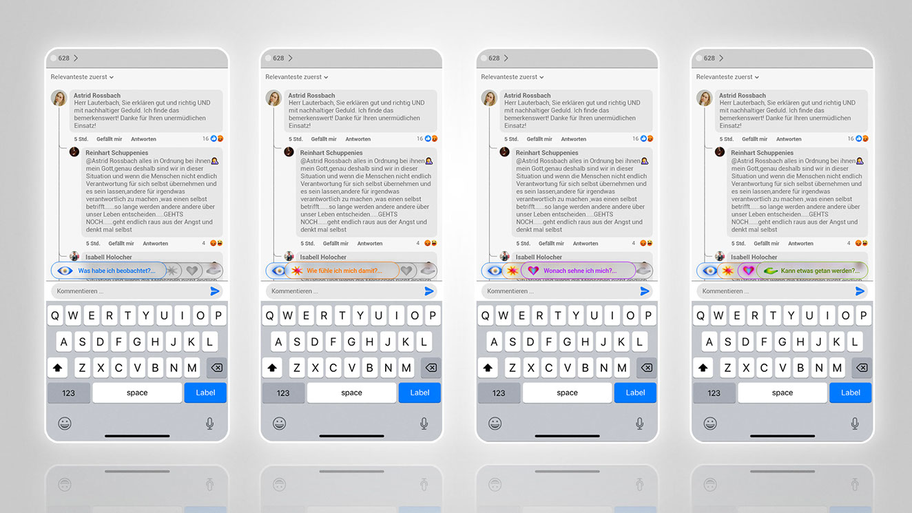 "... all you can hear is the only thing human beings are ever saying - please and thank you." states Marshall B. Rosenberg about his conversation technique nonviolent communication. It suggests expressing personal arguments based upon 1) observations, 2) feelings, 3) needs and 4) requests. This has shown to help with an emphatic and reflective course of conversation. With this project a moderative add-on promoting the use of this technique be implemented into the facebook comment section.